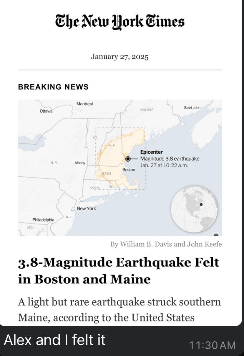 Boston has earthquakes?? My sister texted me to tell me that she felt an earthquake and is ok. I’m glad she, my niece and nephew are fine, I just didn’t know that to be on my worry list for her.
