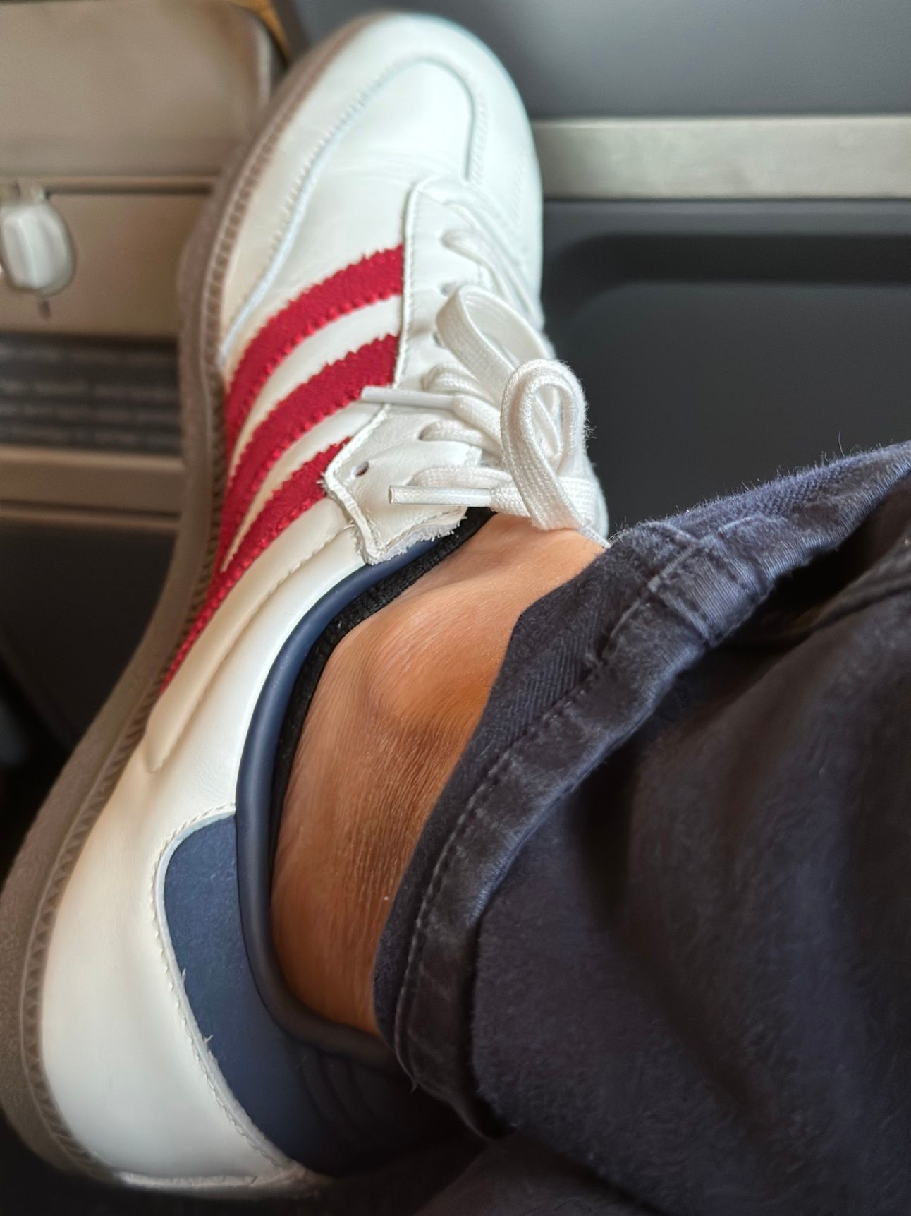 We are airborne now and I just want to say I’m feeling my outfit today - especially my new sneakers; Adidas Sambas.